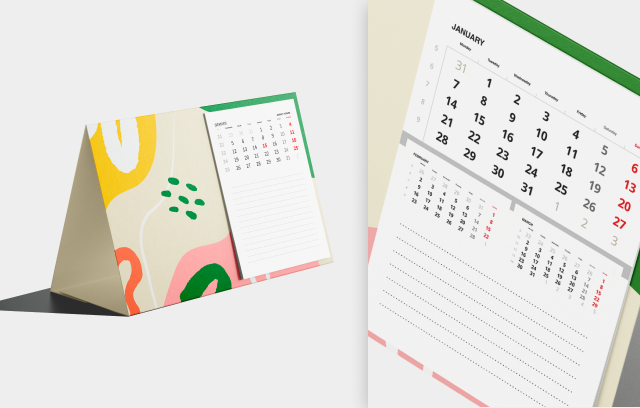 • Piramidka prosta (klasyczna) – rozwiązanie ekonomiczne i trwałe, gdzie całoroczne kalendarium nadrukowane jest bezpośrednio na sztywnym, kartonowym podkładzie.
