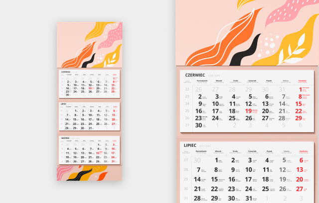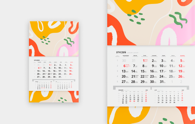 To rozwiązanie łączy w sobie czytelność z większym naciskiem na przekaz wizualny, dając grafikowi szerokie pole manewru przy mniejszym formacie całości. Idealnie sprawdzi się też, jeśli chcesz zaprojektować kalendarz marketingowy.